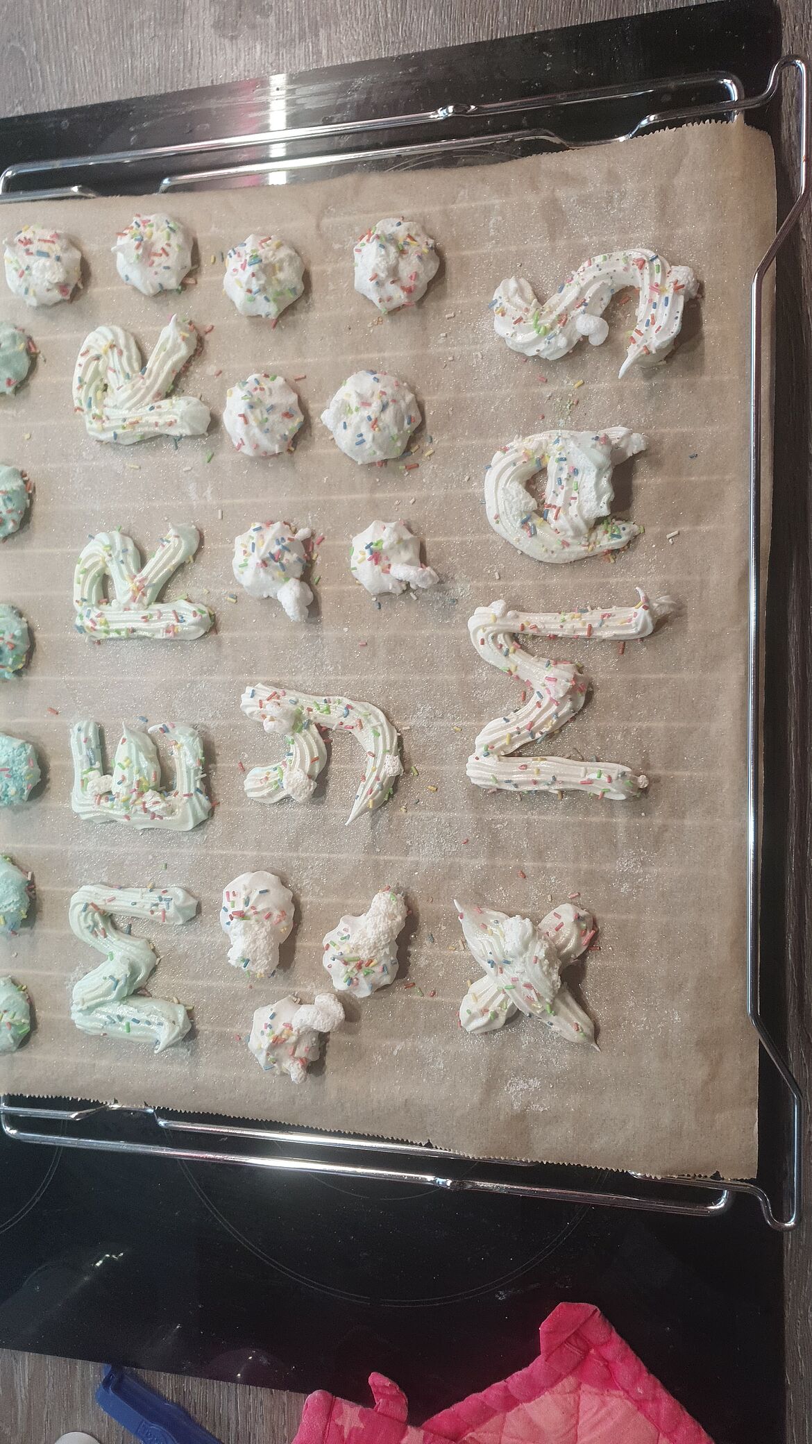 - Ein Backblech mit Backpapier auslegen, die Baiser-Masse in einen Spritzbeutel füllen und kleine Tupfen, Ringe oder Streifen auf das Backblech spritzen. Im vorgeheizten Backofen bei 150 °C ca. 25-35 Minuten backen. Die Baiser-Stückchen dürfen nach dem Backen im Inneren noch etwas weich sein! Zum Abkühlen auf ein Kuchengitter geben.