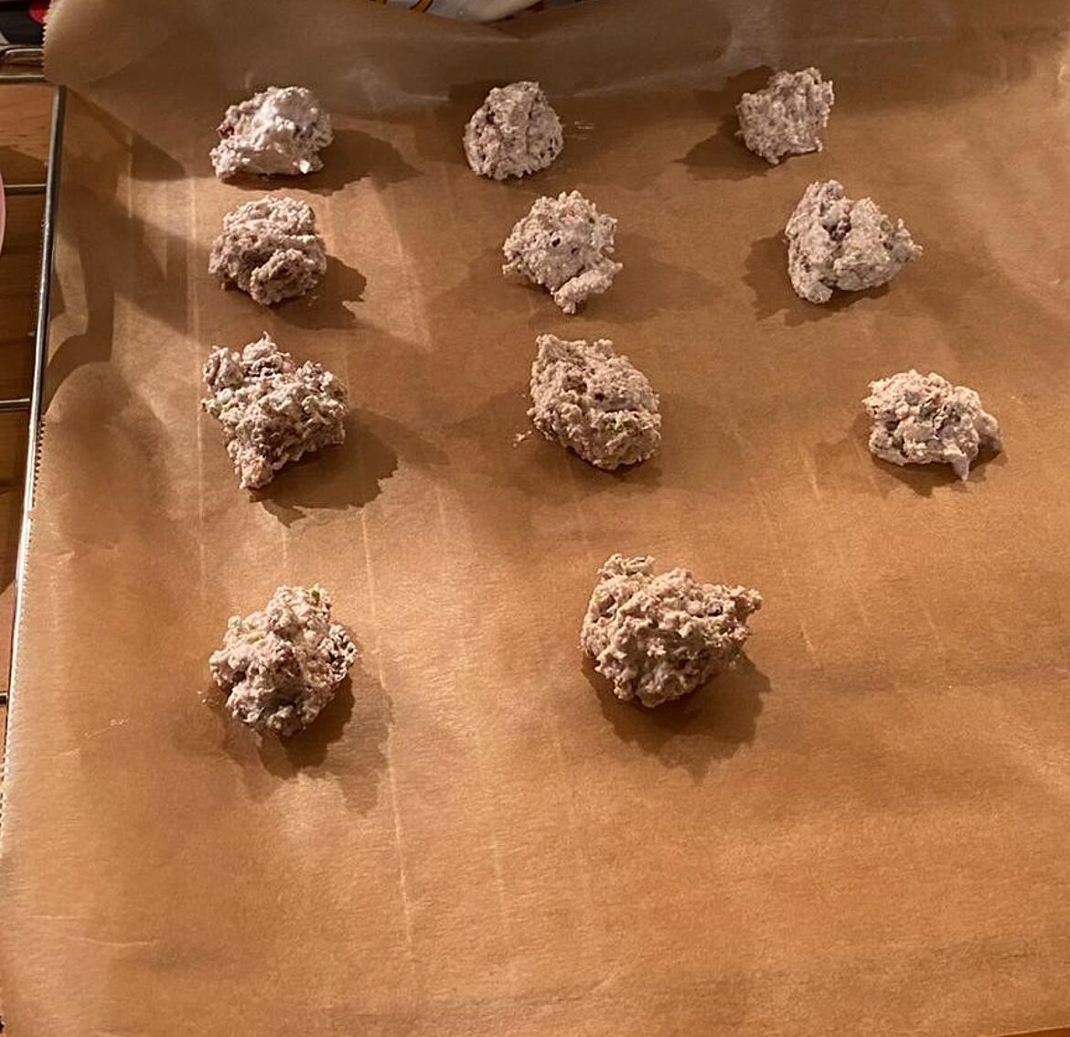 - Backofen vorheizen und 2-3 Bleche mit Backpapier belegen. Die Makronenmasse mit einem Spritzbeutel ohne Tülle als kleine Tupfen auf das Backpapier setzen. Auf der unteren Schiene backen (trocknen). Abkühlen lassen und luftdicht aufbewahren.