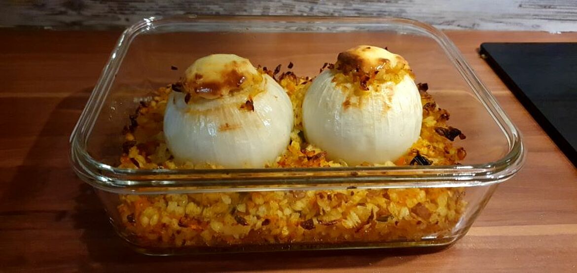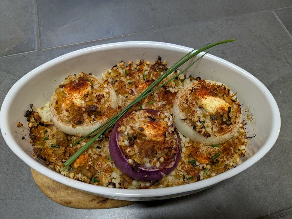 Gemüsezwiebeln mit Reisfüllung und veganem Reibegenuss überbacken. Geeignet als Vorspeise oder Hauptgericht mit Püree.